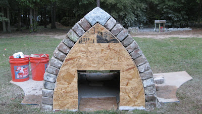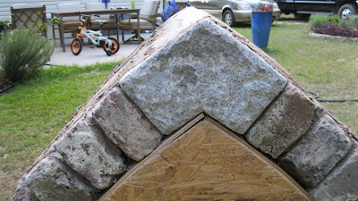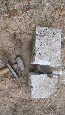 After topping out and dry fitting the key bricks, the next step was to carve the granite key stones for each side. I had brought back some scrap granite from a project in MA last year. ( Clark, I owe you a post about that one..it was granite steps.) Click on the pictures to enlarge them if you wish.