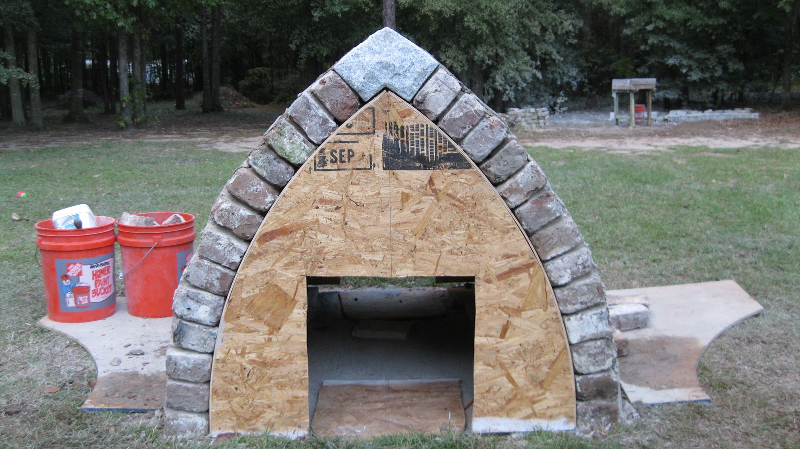 All mortared in. The mortar between the keys is about 1.5″ at the point because the brick keys had a flat top. This was because cutting diamond shape keys would have wasted a lot of the remaining whole brick and I may need them for finishing on the oven.
