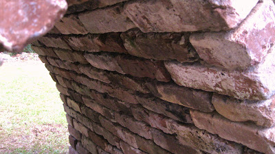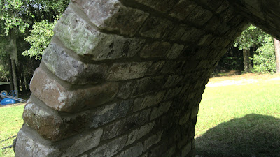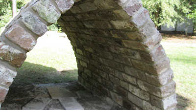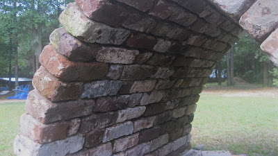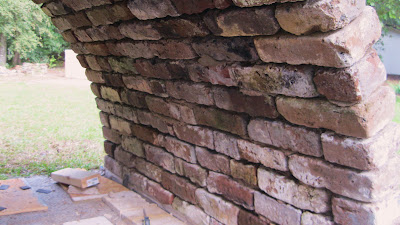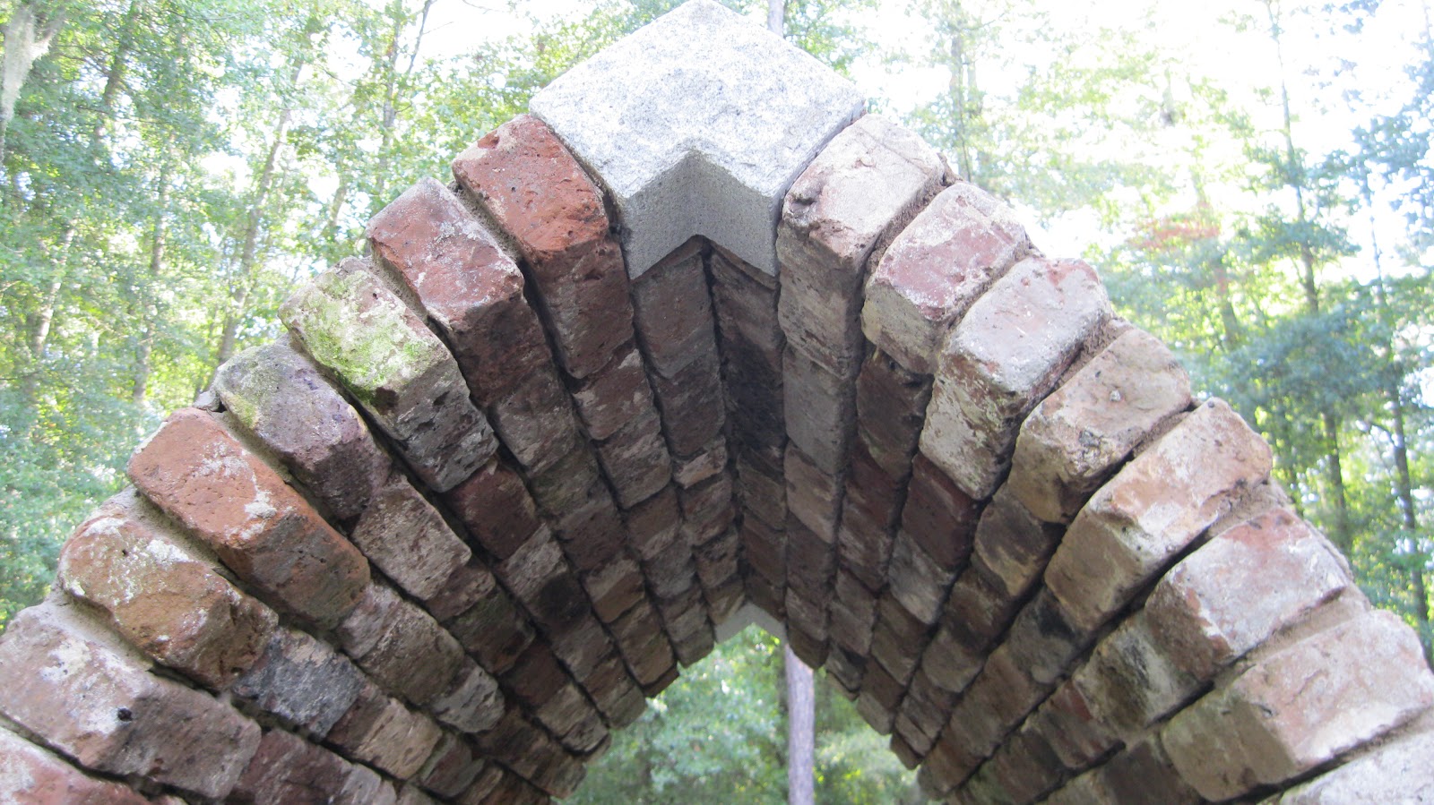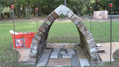 After the granite keystones and brick keys were mortared in I let the work set up for a couple days. This allows the mortar to reach an exceptable degree of hardness because I didn’t want to risk pulling the arch apart if it got stuck. My Dad was with me a so he gave me a hand sliding the form out after all the wedges were pulled. The form got jammed up a little bit because some of the mortar squeezed out of the front of the brick and stuck to the form. The solution to this was removing the face boards of the form so the sides could flex inward to allow it to slide out. Here is what it looked like after the form came out.