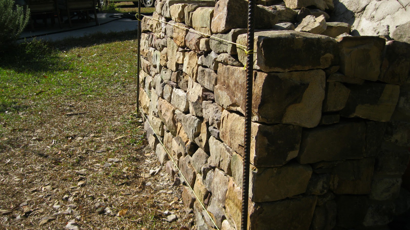 Man, I don’t know how you can place stone with all that going on. No, Clark I personally have never seen that kind of string set up. Usually I use only two lines with the rebar or stake establishing my batter.