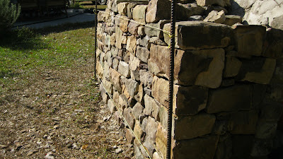 See how the string on the top of the picture lines up but as you look along it to the bottom it separates? That would indicate that the rebar closest to me is tilting in OR the opposite stake is tilting out. Make your adjustments according to your desired batter using your tape and level. Most of the time you need only a gentle pull or push to get them straight. If you loosen the rebar, tap it down a little more..sometimes I’ll tamp the ground around the stake with a hammer too. With the strings in line with each other, you have created a plane to which you can set the snouts (farther point on a stones face) to your line which will make a super flat wall. If you want more texture, let the snout break the plane of the lines now and again. If you do the latter technique you will need to add a new line above the top string to have a clear reference. It doesn’t matter that it is higher than the original top line…remember, both rebar stakes are set to the same batter and the string will line up.