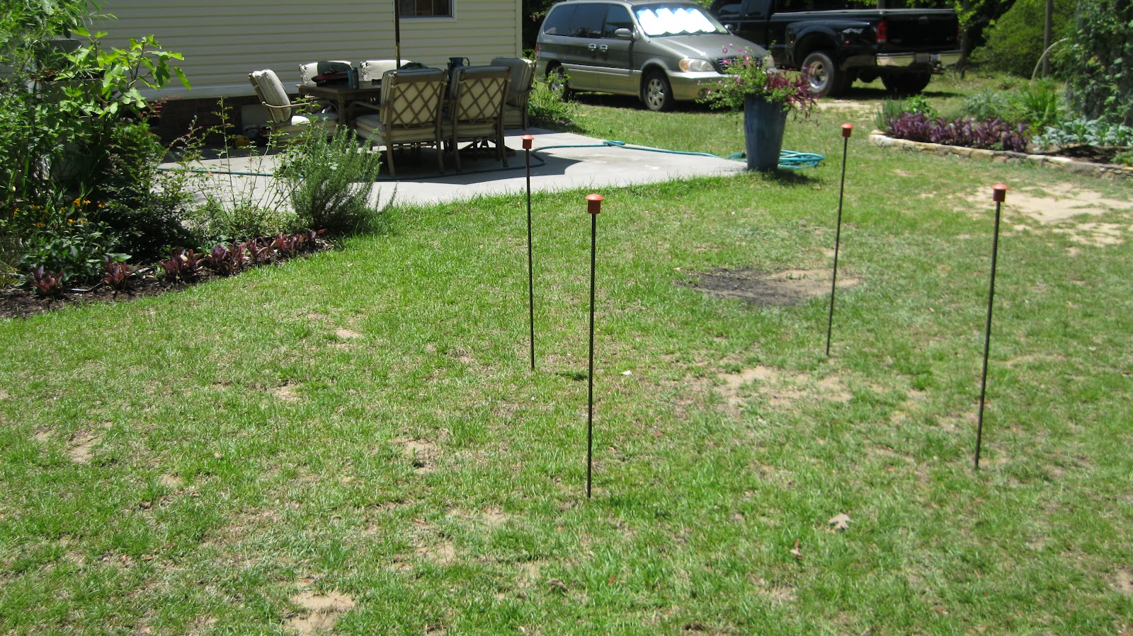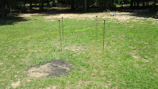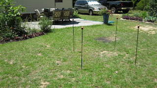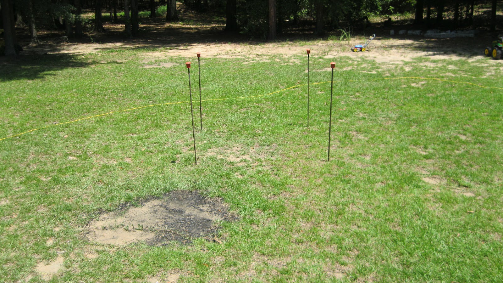 I used a layout square and a straight edge for figuring the footprint of the oven before it was staked out. Once we both were satisfied with how the oven would sit ( in record time I might add) I staked out the corners for the footings.