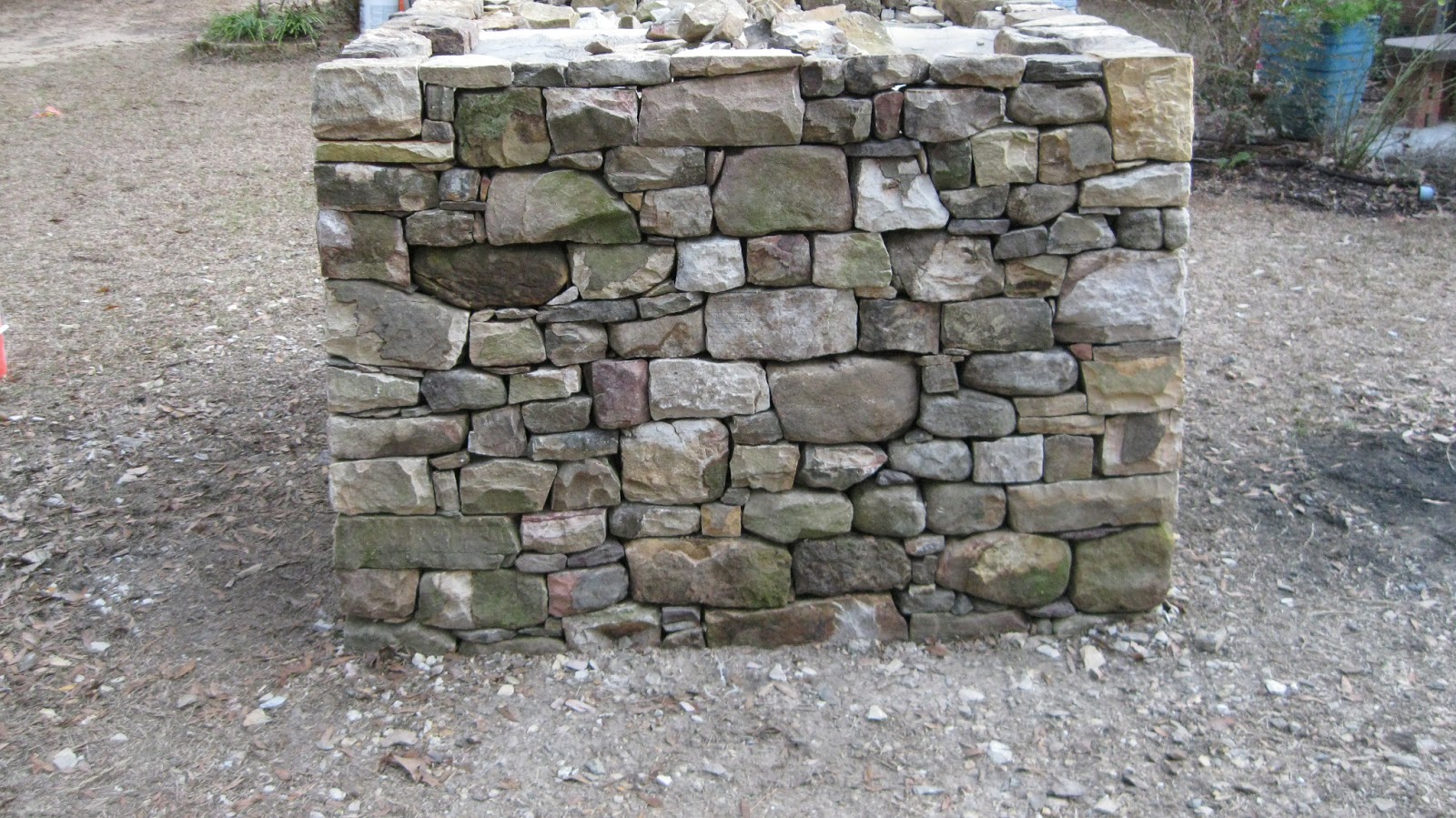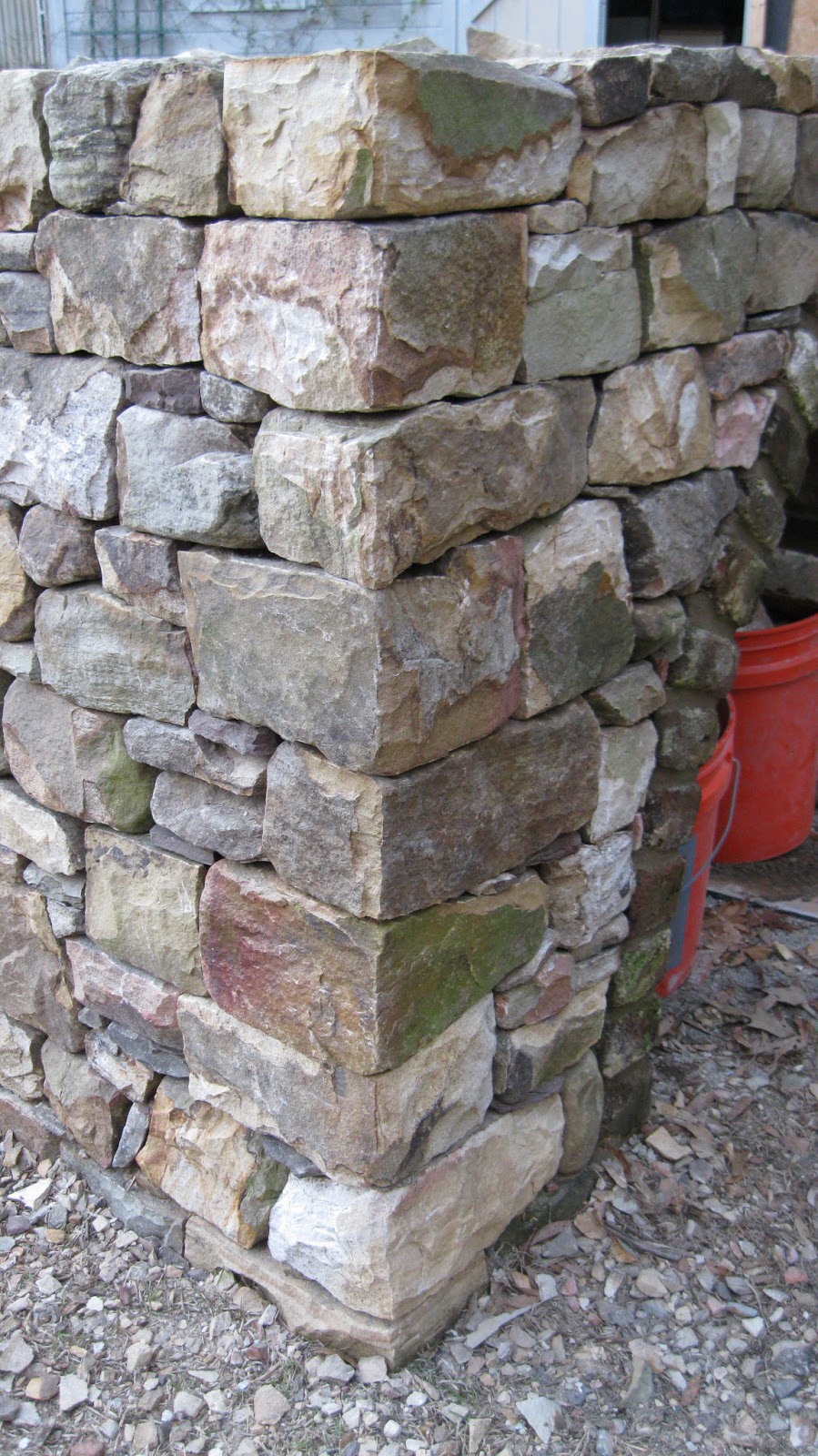 The top course will actually have to be mortared in with another row of stone behind the face. This will serve as a bond beam around the top perimeter of the base for when I install the, um ……next design element. There is not even a trowel full of mortar in the stone base right now. I’ll reveal what the new detail is in an upcoming post!