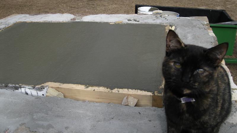 I don’t have any pictures mid-pour, it was too hectic..working alone byproduct! Once I screeded off the slab, our rescue cat/inspector was right there to check it out.